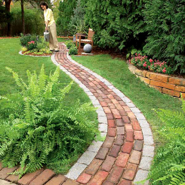 - Чтобы создать стильные «узорчатые» аллейки, вместо плитки для тротуара, можно купить кирпич. Он отлично сочетается в комбинации со строениями из этого материала, а также естественно вписываются в растительный ландшафт. Один совет – купить нужно лишь специальный, тротуарный кирпич, который следует укладывать на раствор.