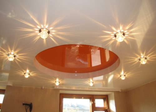 Чтобы нагрев ламп ограничить, лучше применять лампы с зеркальным напылением. Точечные светильники, предназначенные для освещения полотков с натяжными конструкциями, оснащены специальными бортиками, препятствующими проникновению тепла на полотно потолка. Для крытого монтажа следует выбирать низковольтные светильники.