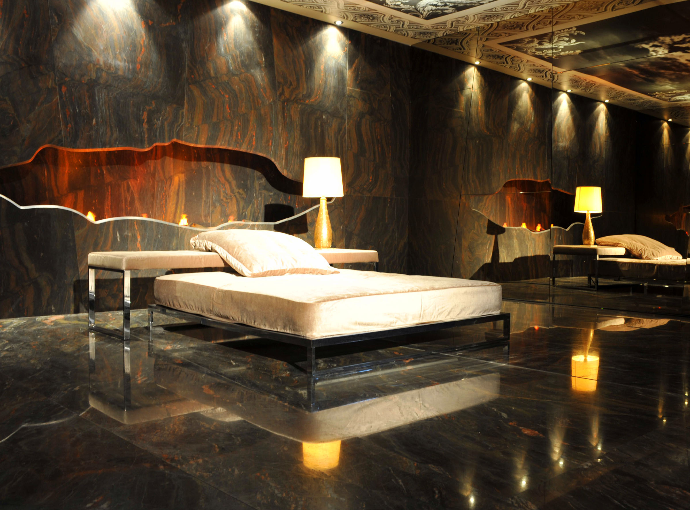 Нередко отполированный мрамор используют в напольных покрытиях. Также из этого камня изготавливают раковины для ванных комнат и кухонные столешницы. А мраморные камины в гостиных имеют более чем роскошный вид. Небольшие декоративные дополнения в виде шахматных досок, статуэток, ваз или чаш из этого камня смогут придать помещению дополнительное изящество и уют.