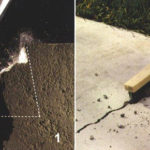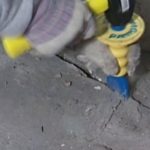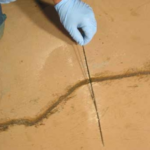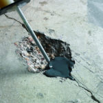 - Сперва на месте растрескивания вырезаем отверстие, как траншею, чтобы более добротно подобраться к трещине и устранить лишние возможности к дальнейшему тресканию.