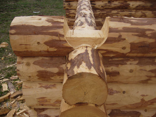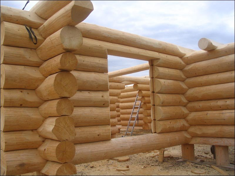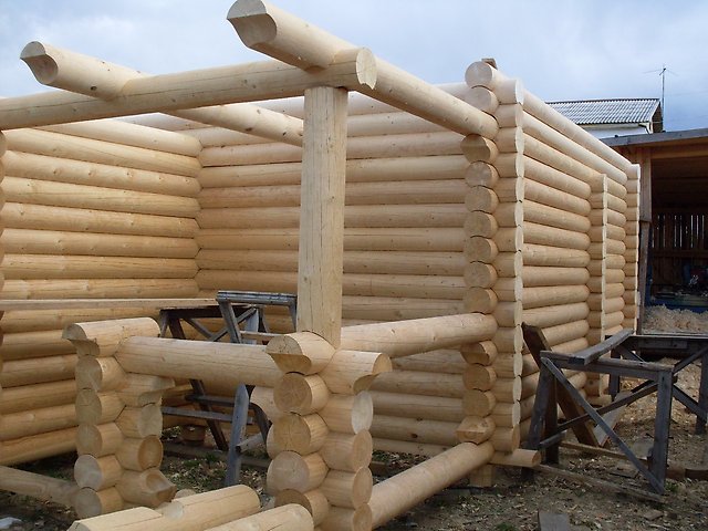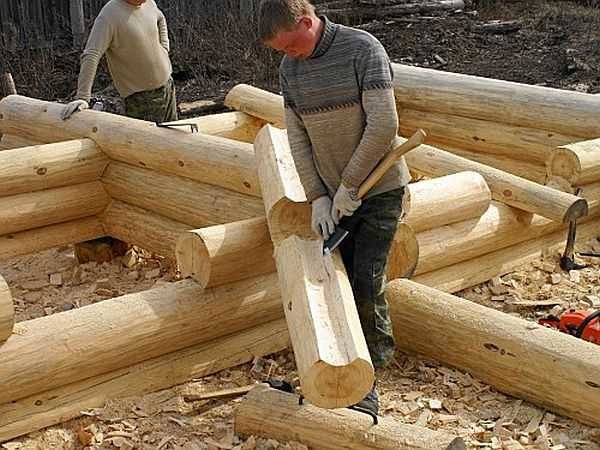 - Берем самые толстые бревна и кладем их на низ строения. Имеется в виду окладной венец. Далее сруб нужно класть способом в обло или в чашу, вырезая округлые проемы (пазы).